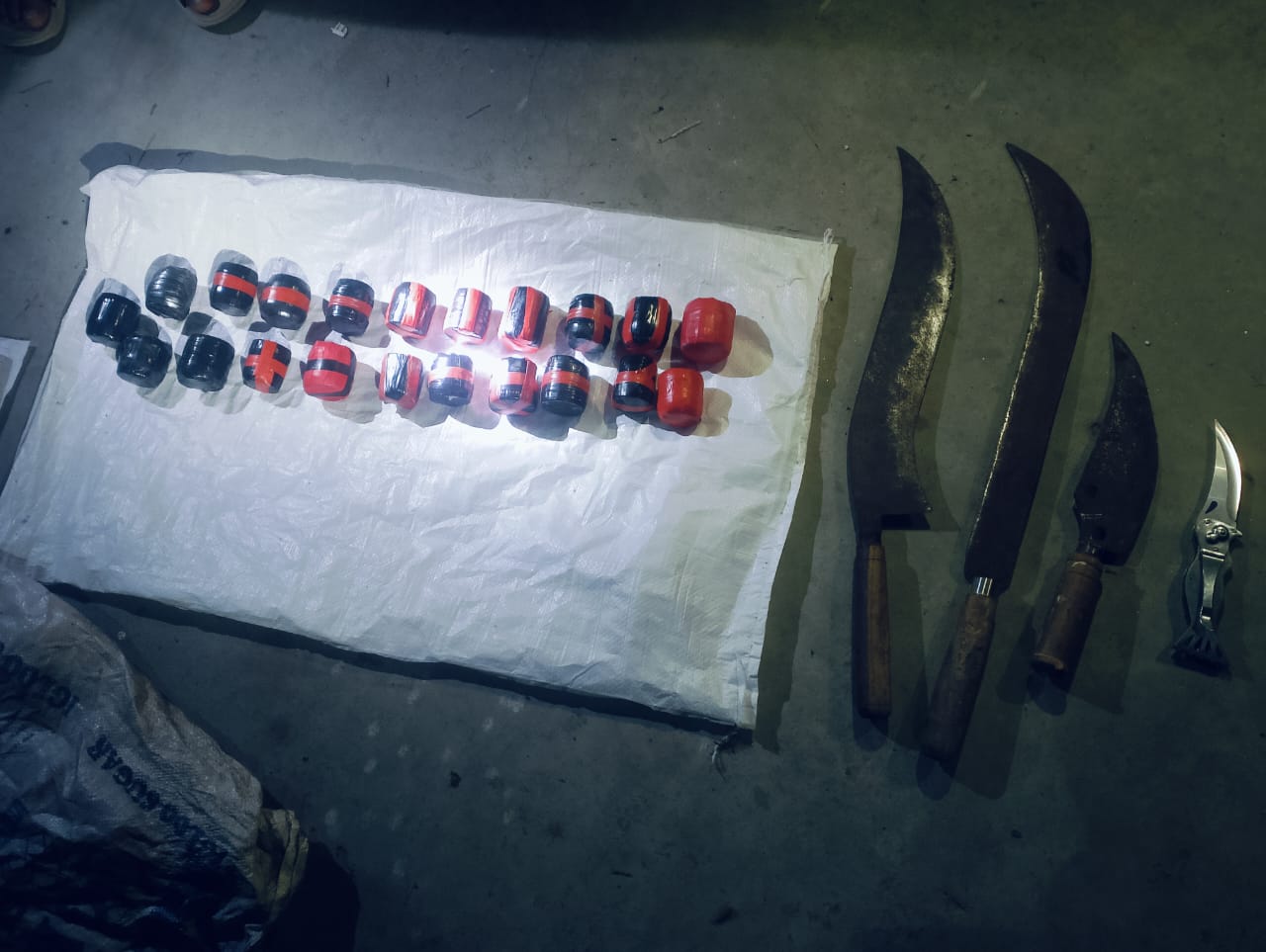 ০১টি বিশাল ছোরা (দৈর্ঘ্য ৬৫ সে.মি.)০১টি মাঝারি ছোরা (দৈর্ঘ্য ৩৮ সে.মি.)০১টি ধারালো চাকু (দৈর্ঘ্য ২৫ সে.মি.)